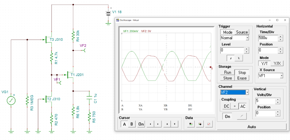 на самом деле даже одной почти хватило. "почти" потому что поставил j310, верхний резистор убрал, но он всё равно ещё нужен будет в будущем. на вход будет подаваться около 4 вольт амплитуды, поэтому я сходу упёрся в отсечку. При чём на обеих схемах и опять по нижней полуволне, естественно) радует только то что такие уровни входного сигнала будут встречаться довольно редко, но всё же... Несомненный + обеих этих схем в том что они дают вторую гармонику, а это в малых количествах в первом каскаде высокочувствительного усилителя для гитары как раз то что нужно. После повторителя сигнал должен быть раскачан по амплитуде раз в 8-9. Инверсия по отношению ко входному сигналу допускается только одна -