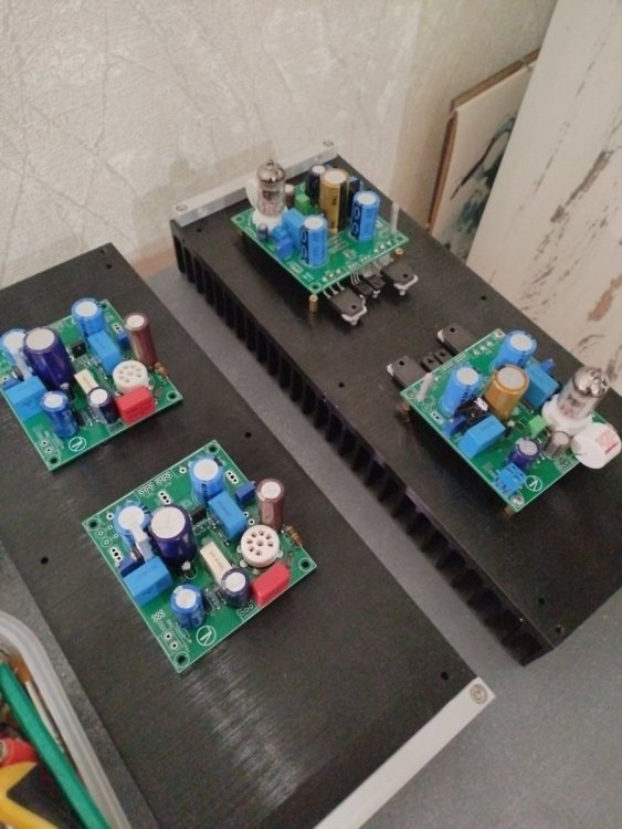 Подходит к завершению очередной проект.Гибридный усилитель "ROSA HB- 1".4платы ВК с СМД монтажем запустились без особых проблем(проверено три различных типа выходных транзисторов в том числе Российские высокочастотныеVL-035). Завтра с знакомым сделаем измерения КНИ,АЧХ и подстройку анодного и смещения,ток покоя.Можно будет завершить сборку. -
